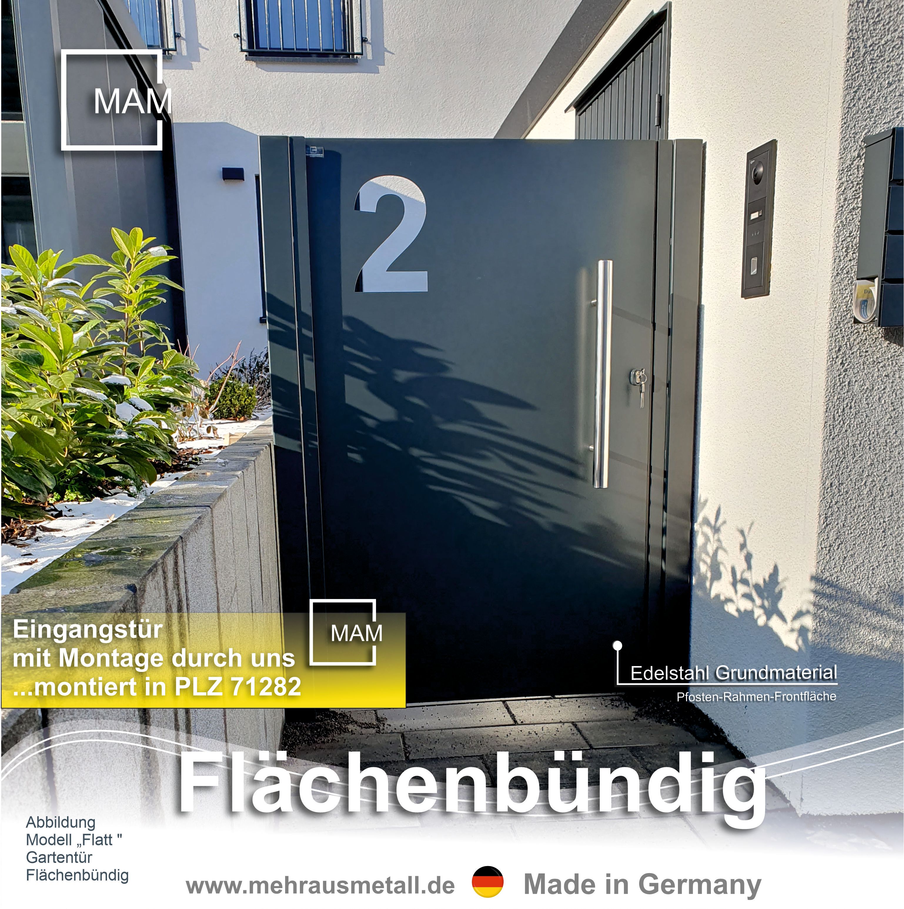Gartentür 1-flüglig nach Wunschmaß zu bestellen aus unserer Serie "Flächenbündig" mit Edelstahl Rahmen, Pfosten und Edelstahlfrontfläche in Wunschfarbe Pulverbeschichtet