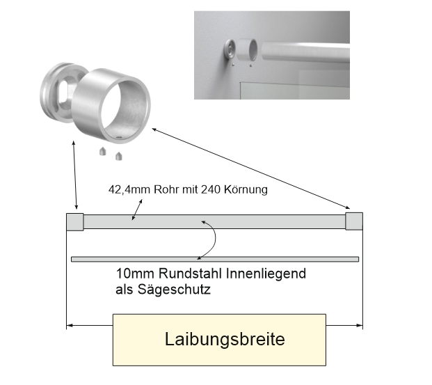 Material 42,4x2mm Rohr mit Wandhalter und Sägeschutz gegen Einbruch mit 10mm Rundstahl innenliegend